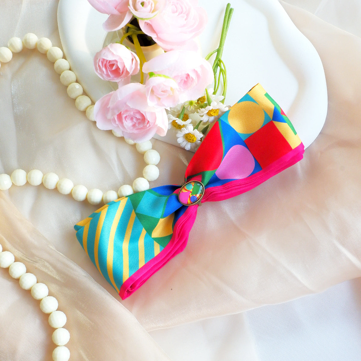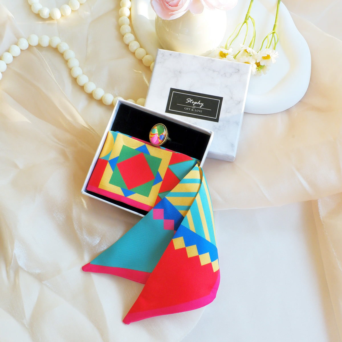 絲巾運用幾何圖案來表達簡約和現代性,透過鮮明的色彩和形狀,創造出時尚感。絲巾的材質輕柔,帶來舒適的觸感,既可以用作時尚配飾,增添穿搭的層次,也可以隨意綁在手腕或頭髮上,展現個人風格。