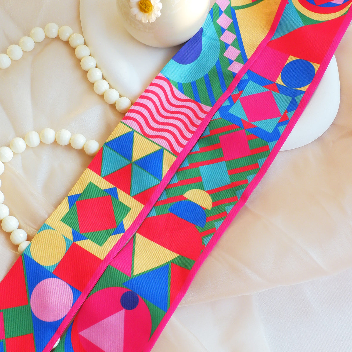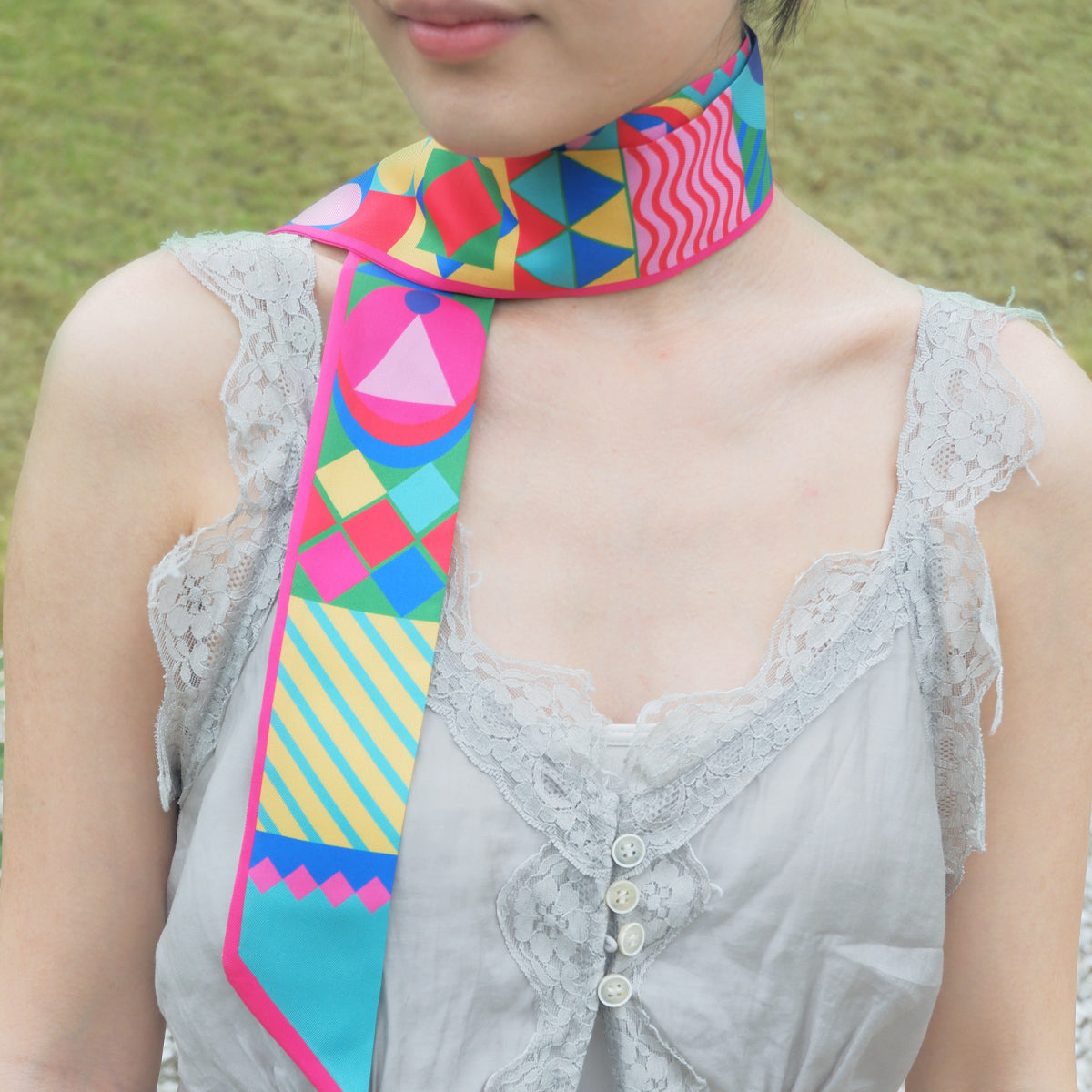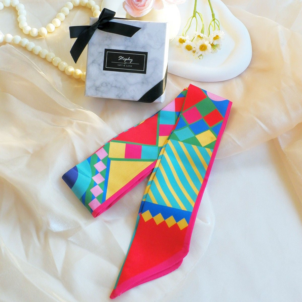 顏色豐富, 簡單搭配更顯精神飽滿愉悅的幾何圖長絲巾禮,  雙面長絲巾可以綁在脖子, 腰間, 可以作為髮飾,也可以綁在手提包和草帽上作裝飾,一物多用,可配搭任何形象.Twilly 長絲巾 / 領巾 / 髮帶