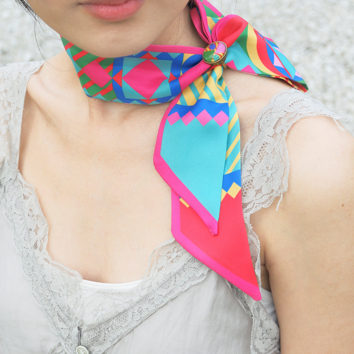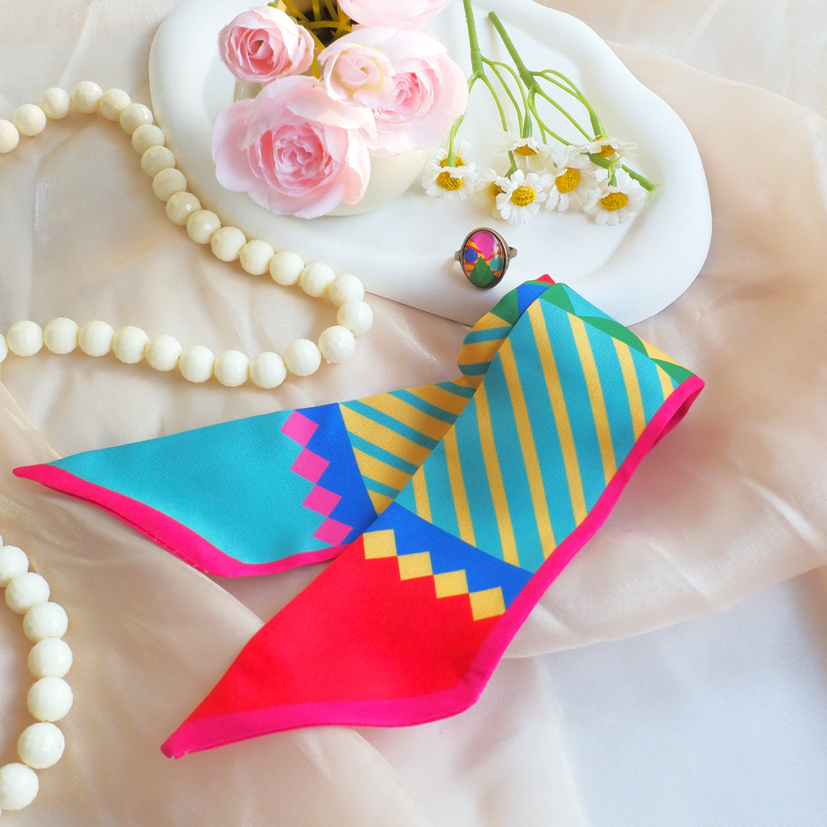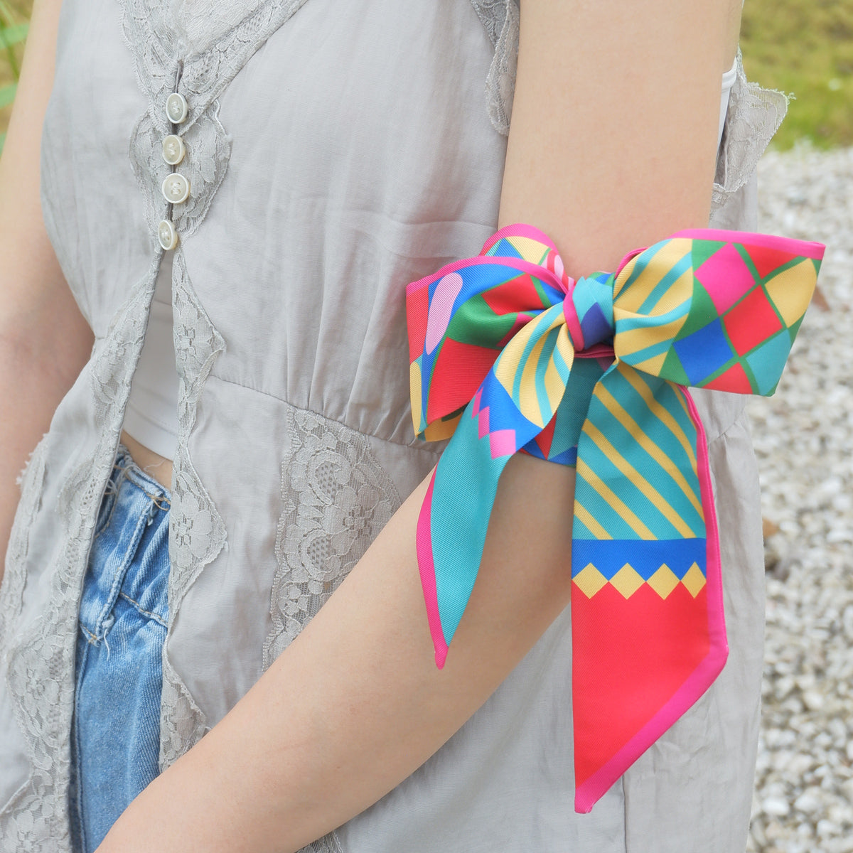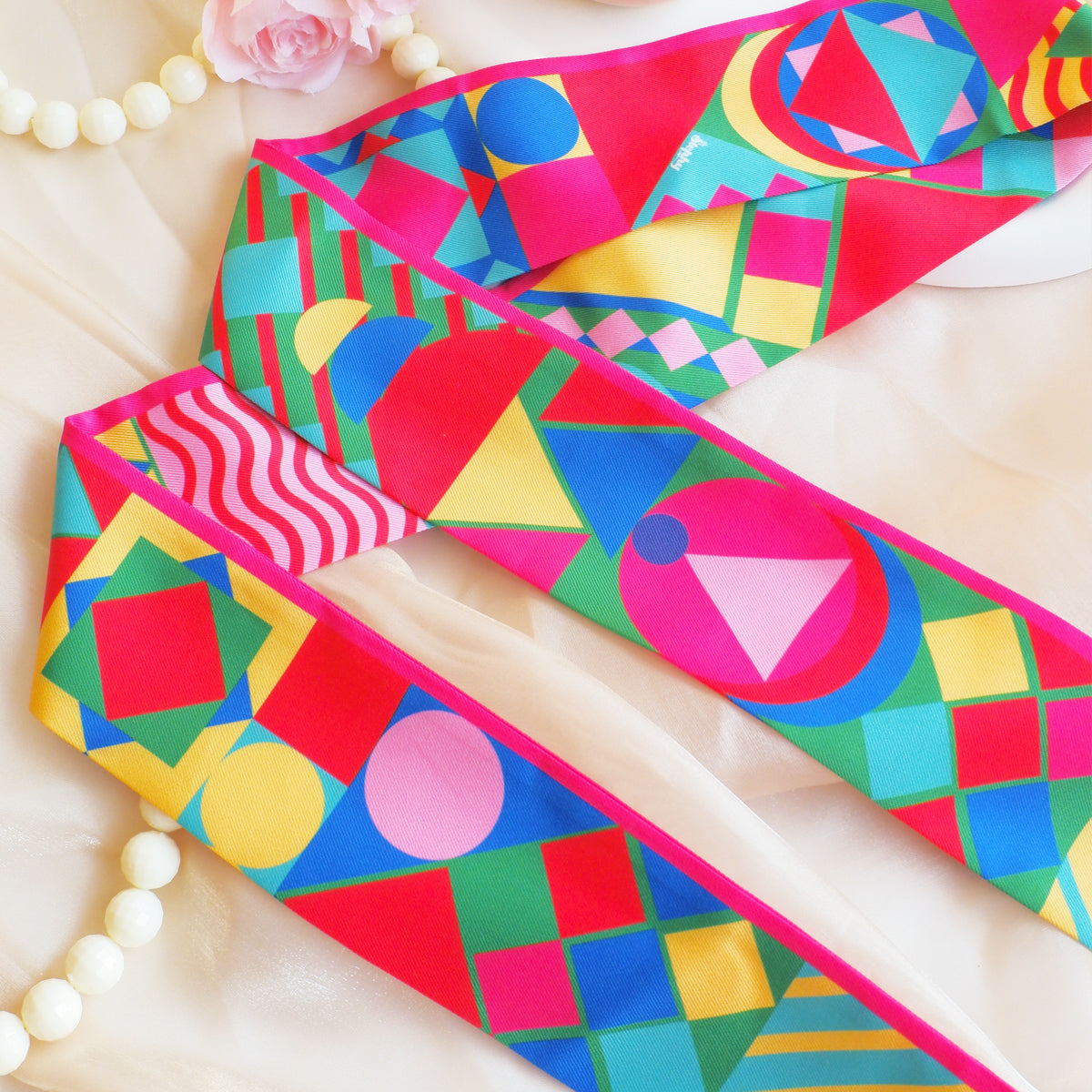 顏色豐富, 簡單搭配更顯精神飽滿愉悅的幾何圖長絲巾禮,  雙面長絲巾可以綁在脖子, 腰間, 可以作為髮飾,也可以綁在手提包和草帽上作裝飾,一物多用,可配搭任何形象.Twilly 長絲巾 / 領巾 / 髮帶